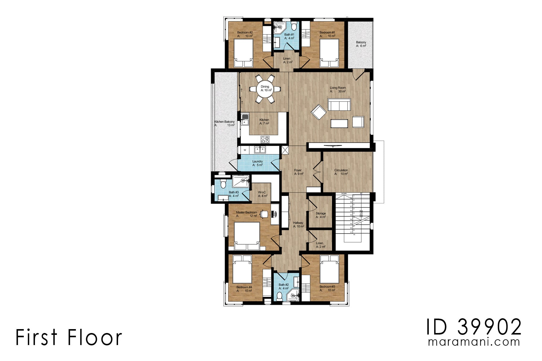 Each floor and unit has 5 bedrooms including one master ensuite. Master suite comes with a walk in closet and a working space for a home office. On the left side end and right side end there are 2 bedrooms with a shared bathroom. The Living room, dining and kitchen are an open plan and defined by furniture layout. Dining area opens to a kitchen veranda at the rear of the building. Living room opens to a balcony which used for a viewing deck. The plan comes with a laundry, a storage area and a linen spaces at the center of the plan.