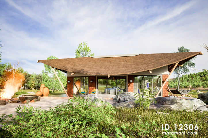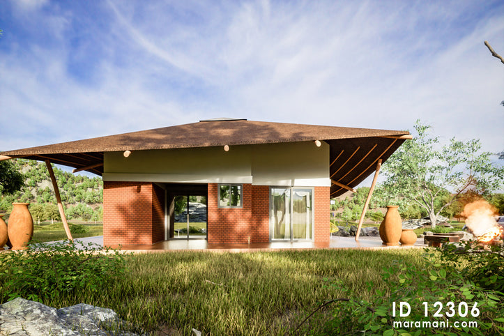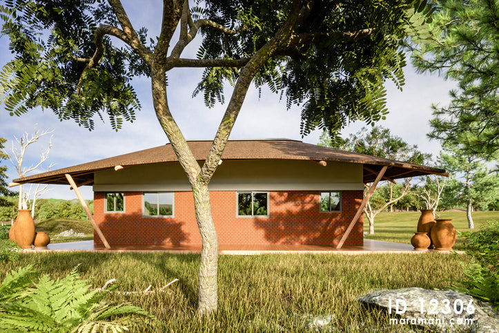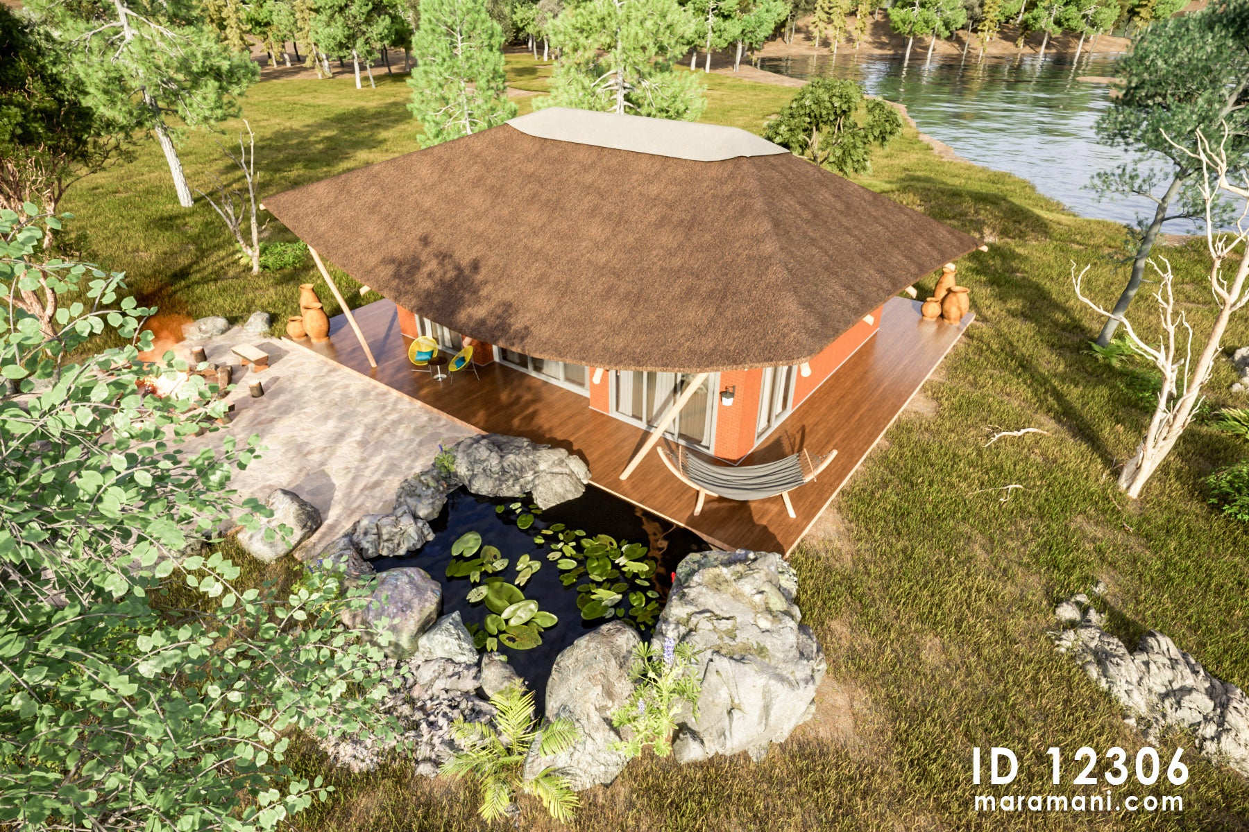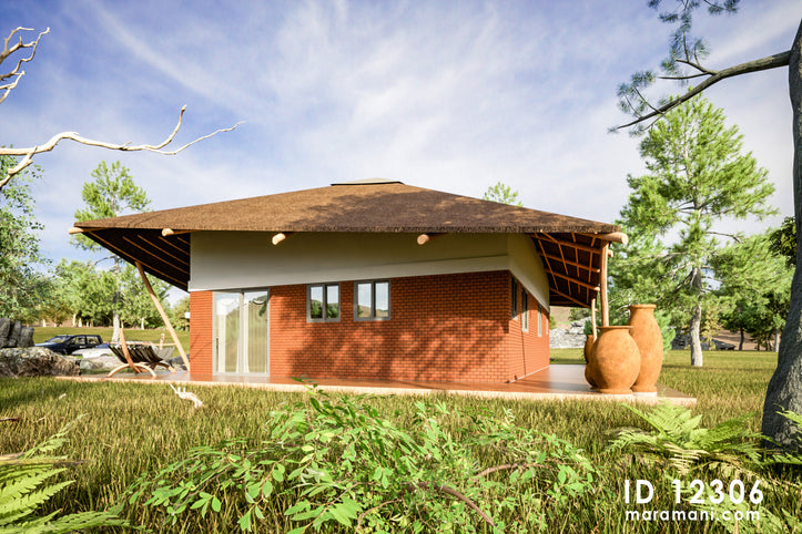 This two-bedroom house with a thatched roof is a great choice for the countryside. A thatched roof's natural appearance will complement its surroundings beautifully, and, depending on the type of thatch you use, it could go decades without maintenance.