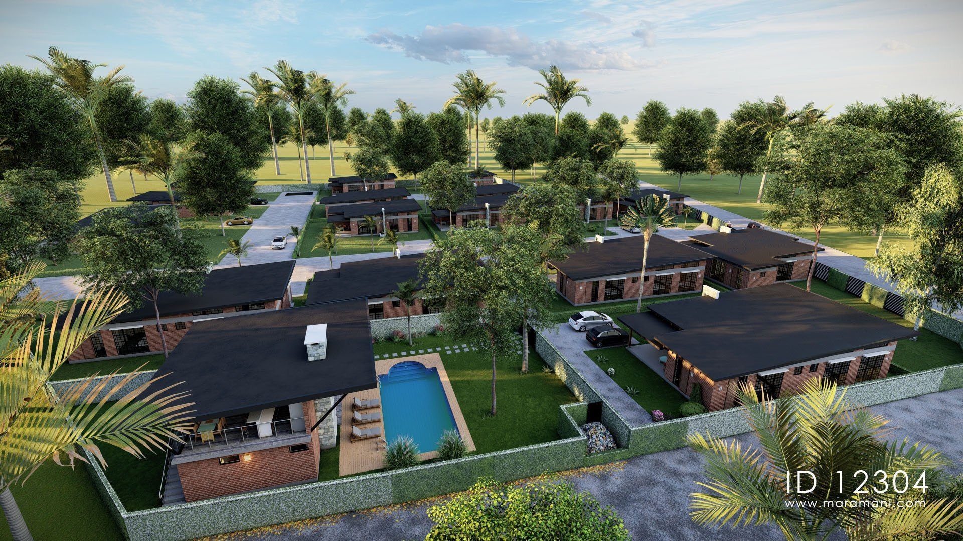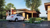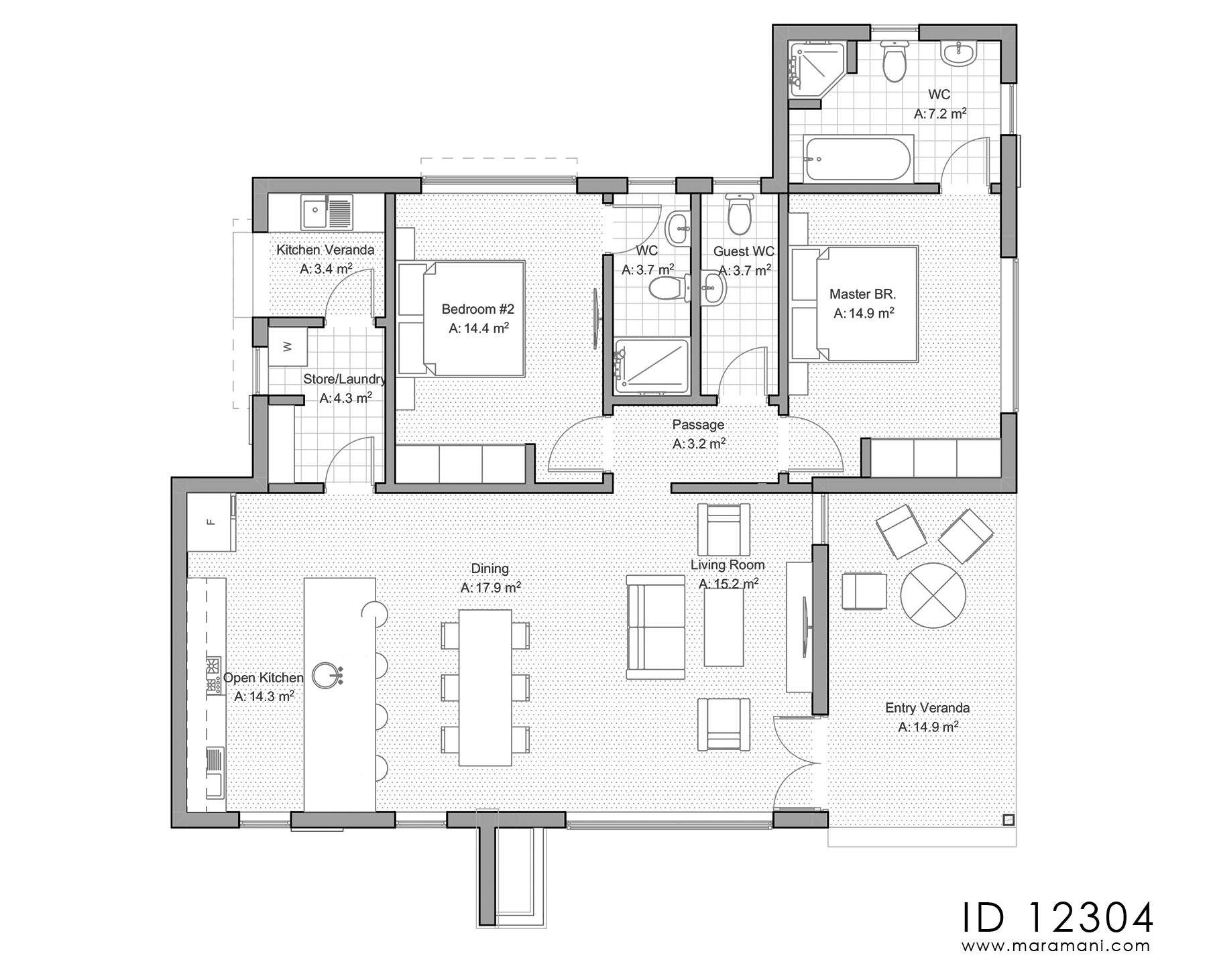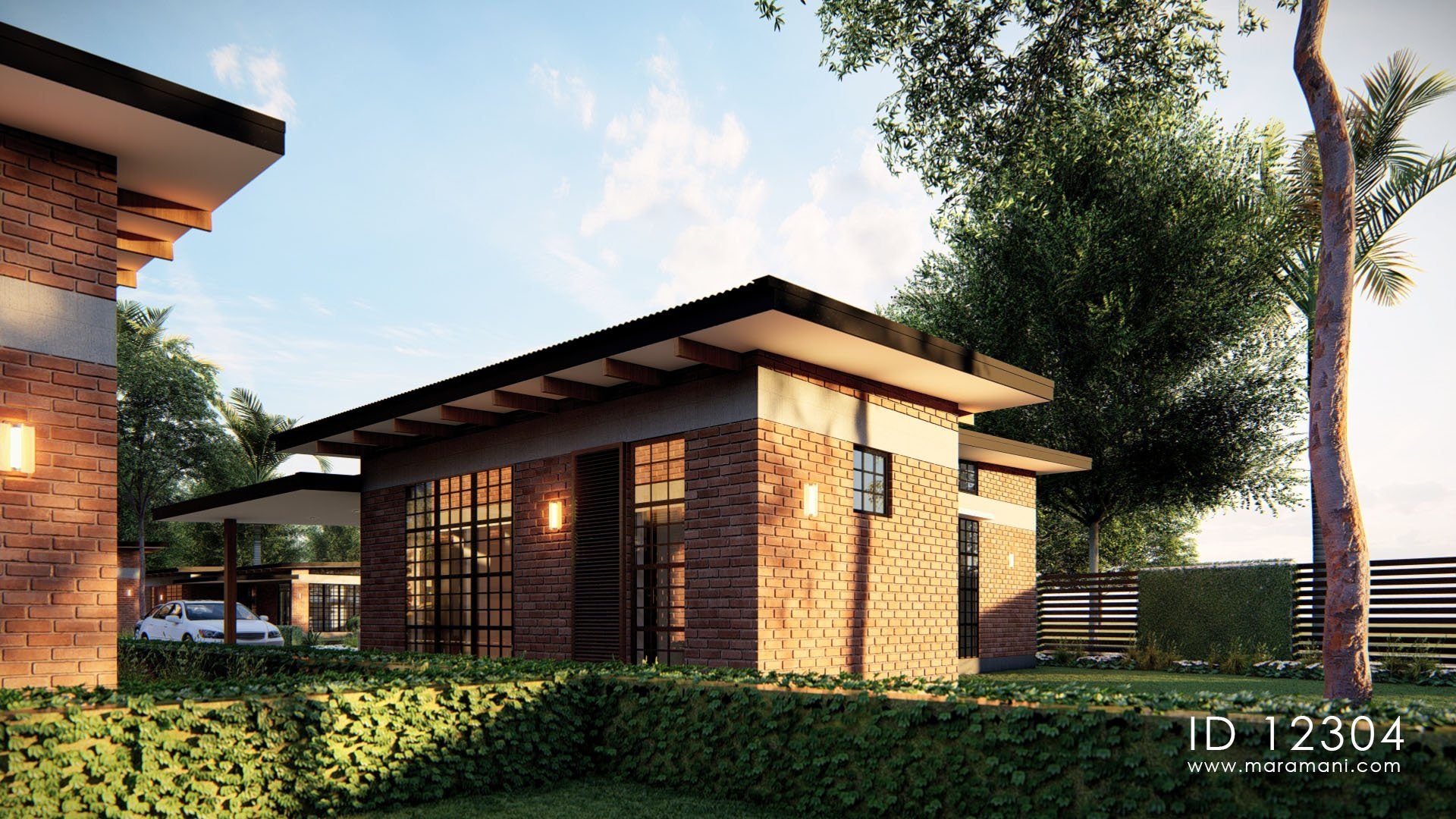 The front contains the common spaces. The back contains the bedrooms and more private facilities. This 2 bedroom home utilizes easily available materials including burnt bricks, steel casement windows, metal sheet roofs and screed floors. This not only brings down the cost of material but due to it's simplicity also brings down the cost of labour. An open plan layout connects the kitchen, dining and living area into a single space for a contemporary feel within a traditional home. View a similar plan with 3 bedrooms HERE