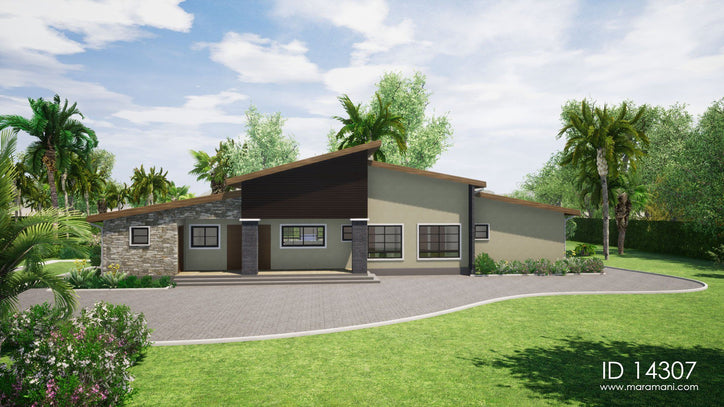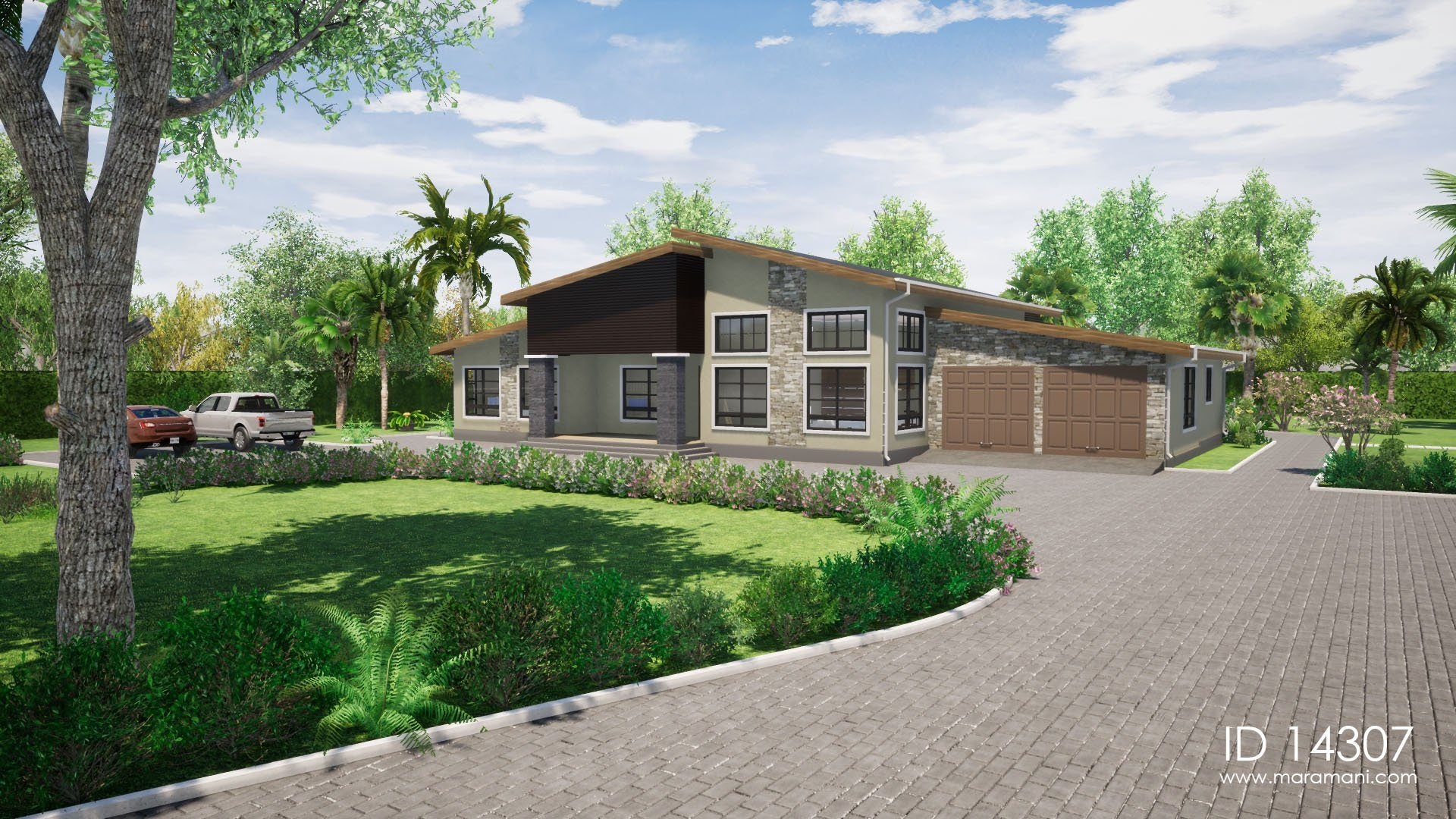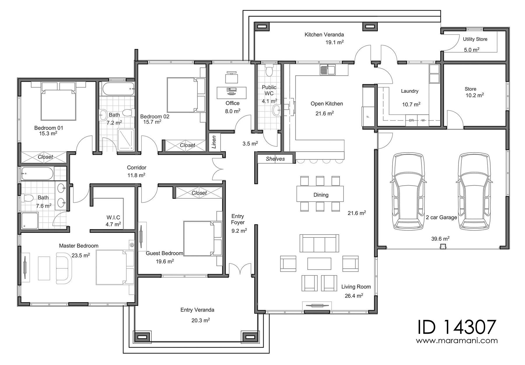 Extra high ceilings is a standout character of this house specifically suited for hot climates. Extra ceiling-high windows allow for a natural breeze through the house removing all hot air. The plan includes 4 bedrooms of which the master bedroom is en-suite with a bathroom and walk-in closet. The three remaining bedrooms share a bathroom in the private area of the house while an additional bathroom located close to the living room is for guests. A double car garage connects to the kitchen and includes a large store for tools, bicycles and equipment. The open kitchen plan with a breakfast counter ensures this beautiful plan stays contemporary and creates an intimate social atmosphere for the whole family.
