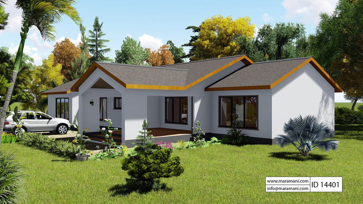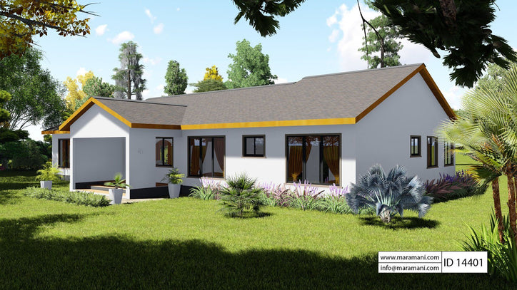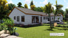 A large 4 Bedroom countryside house with basic amenities. From the large covered front verandah, you step right into a spacious foyer with access to the living room and a modern open plan kitchen and dining. The kitchen has a small pantry and a door leading out to the kitchen verandah from where you can access the laundry. On the left side of the building, you find all 4 bedrooms. Two of them share a bathroom, ideal for the children while the third comes ensuite perfect for a guest room. The master bedroom has a big bathroom with both a bathtub and shower as well as a walk-in closet. If you are looking for a spacious plan to build within a reasonable budget, then this is the one. The very simple yet beautiful house plan is designed with standard details which ensures a low construction cost budget.