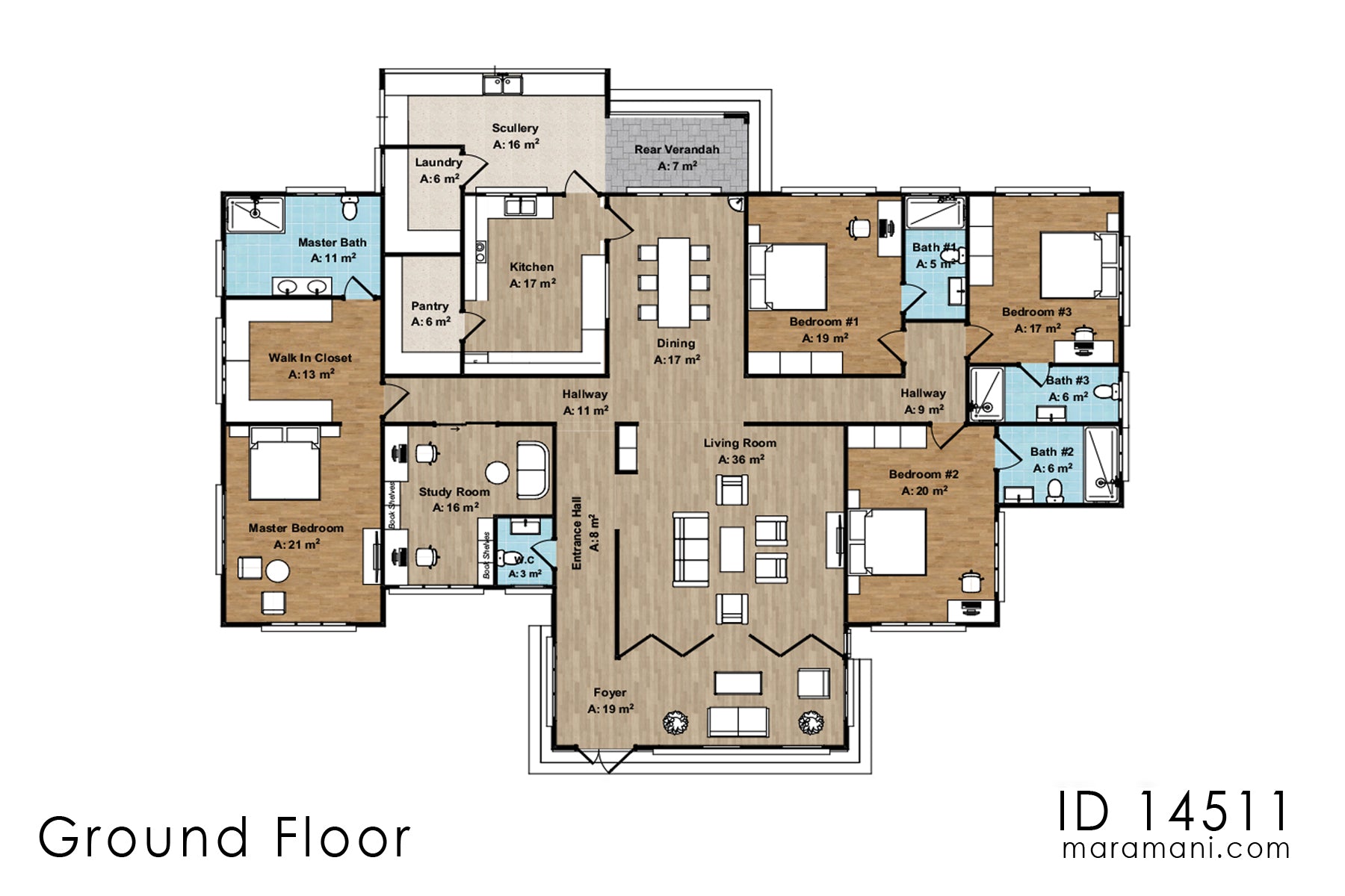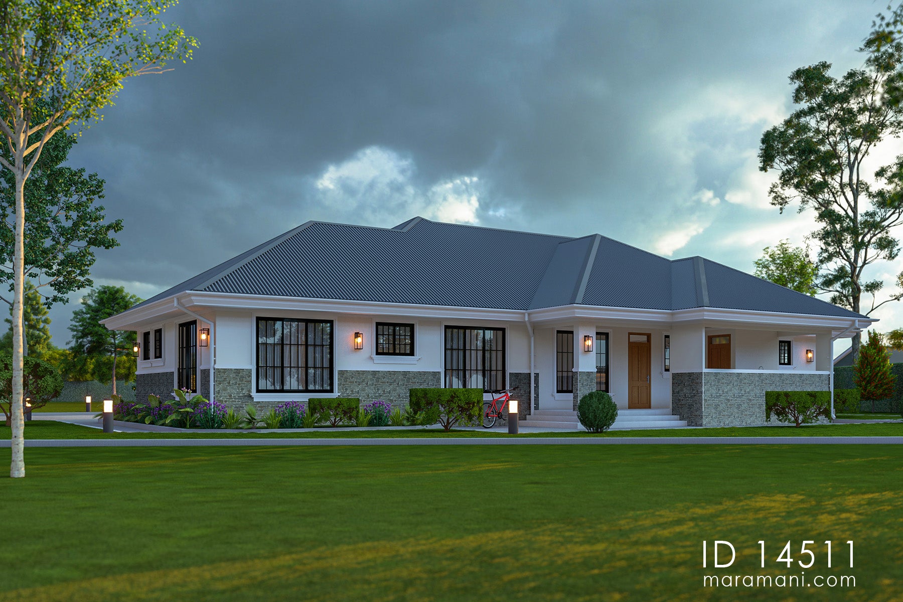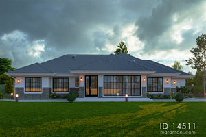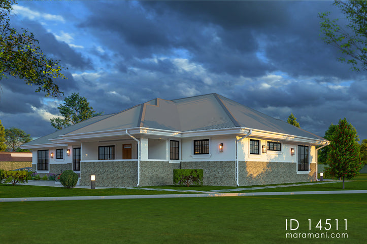 This 4-bedroom modern bungalow house has all the amenities needed for any family. As you approach this house you'll love the stone accent touches on the facades of the house. From the entrance hall, you have 3 options. Straight ahead there is a dining, kitchen, pantry, laundry, scullery, and rear veranda. To the right, there is a living room and 3 rooms which are en-suites. To the left, there is a guest toilet, study room, and master bedroom. The master bedroom is secluded to give the parents the privacy they need. Take note of the master's en suite with a walk-in closet and master bath with dual vanities.