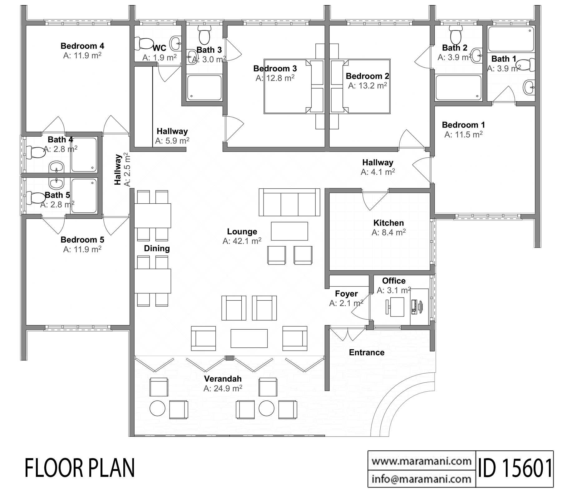 Are you planning to go into the Bed and Breakfast business? This plan Lodge plan with 5 bedrooms comes with all amenities well placed to allow a minimum building footprint with maximum use of space. All bedrooms are en-suite with their own WC, bath, and sink. The B&B plan includes a small kitchen, manager's office, and public WC. The bedrooms surround a common lounge and dining area which opens up to a 25 square meter verandah which is perfect for the late morning breakfasts or just relaxing in the evening.