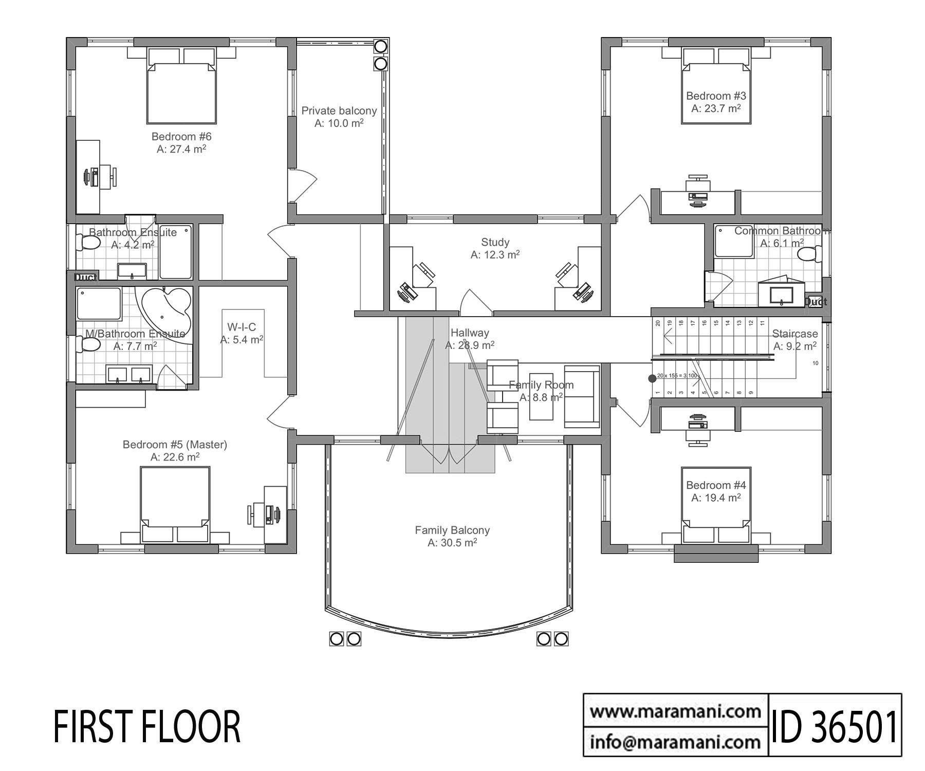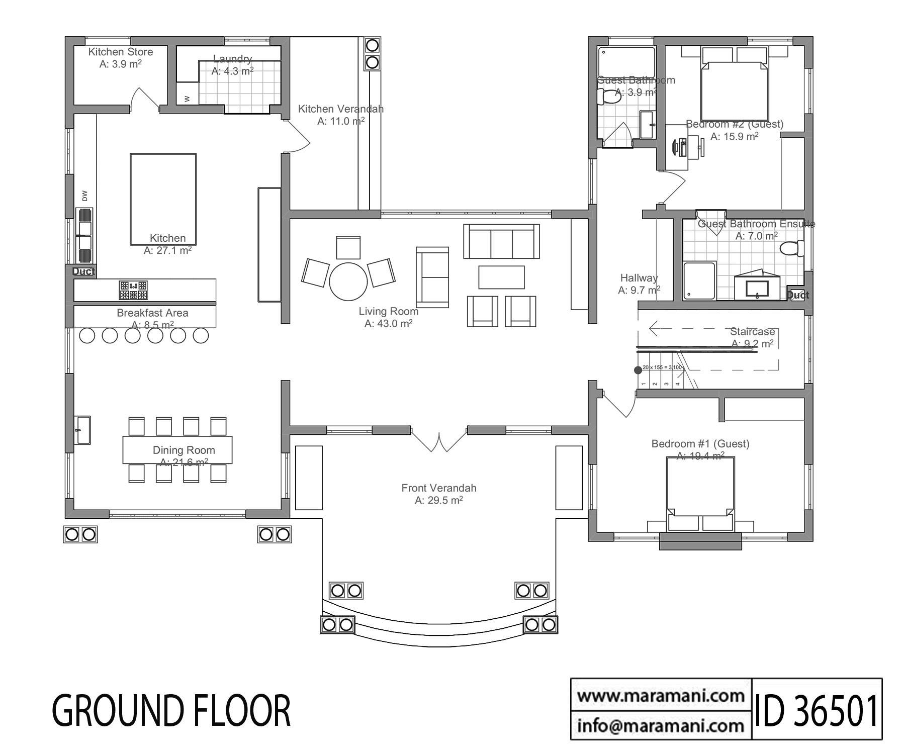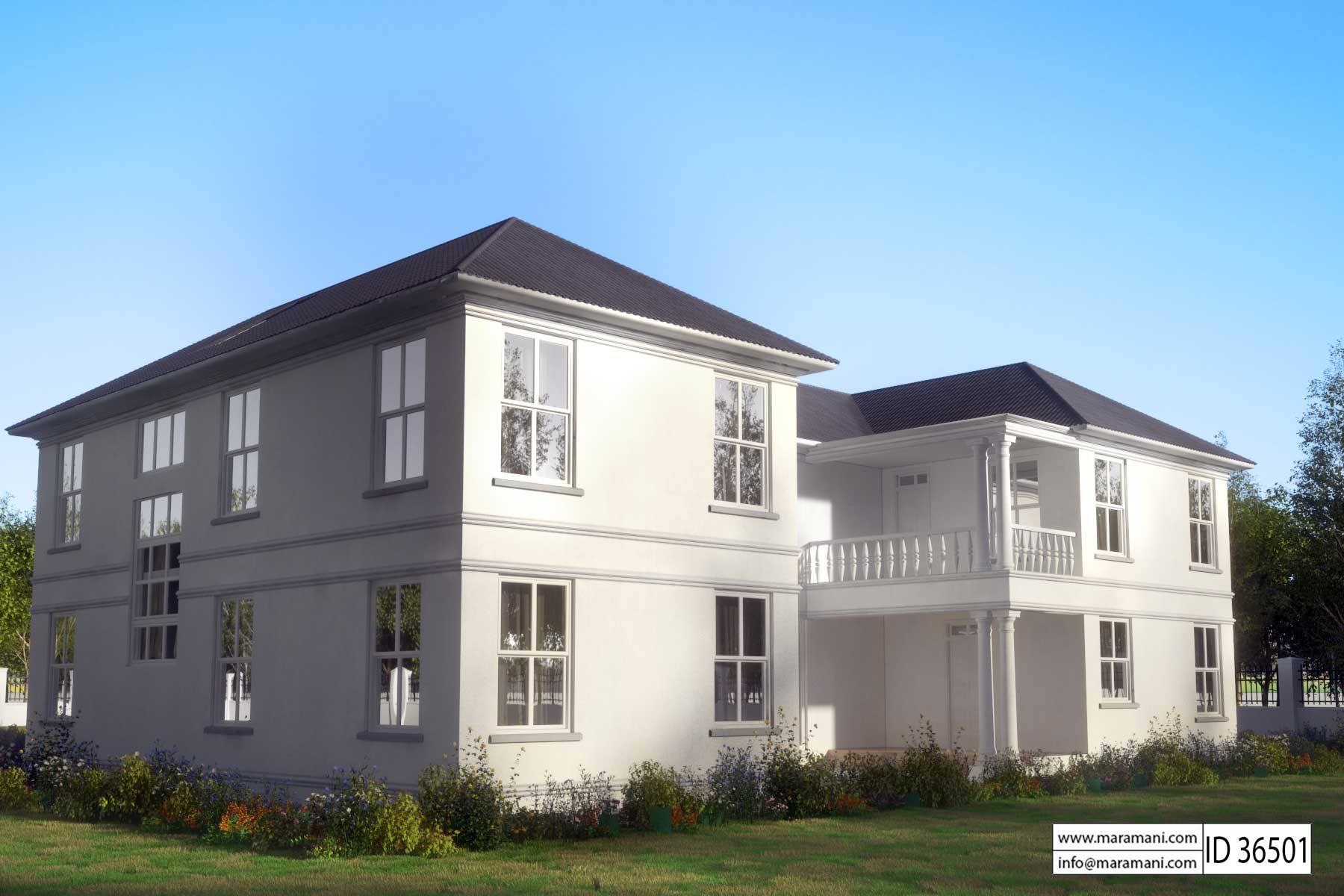 Inspired by the American country house this beautiful 2 story bungalow house plan contains 6 bedrooms and 5 bathrooms on 2 floors. A covered terrace connects directly to the family room on the first floor doubling the common space. A similarly large terrace connected to the attic leads out through a dutch colonial inspired roof. The house is designed to be able to host a large number of guests at any time for events such as BBQs, meetings and overnights.