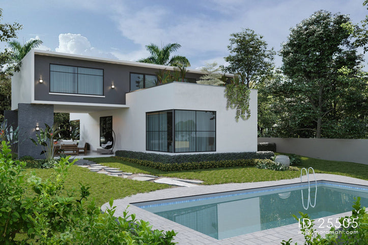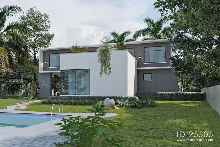 A contemporary house plan consisting of two rectangles placed diagonally on top of each other. This allows all rooms on the first floor to have a view of the garden and pool. An open plan combines the living room, dining and kitchen into a single space accessed through a beautiful passage. A large covered veranda on the ground floor and two large balconies to the front and back of the house give plenty of space for out door seating and socializing. A magnificent piece of architecture for the 21st century family.