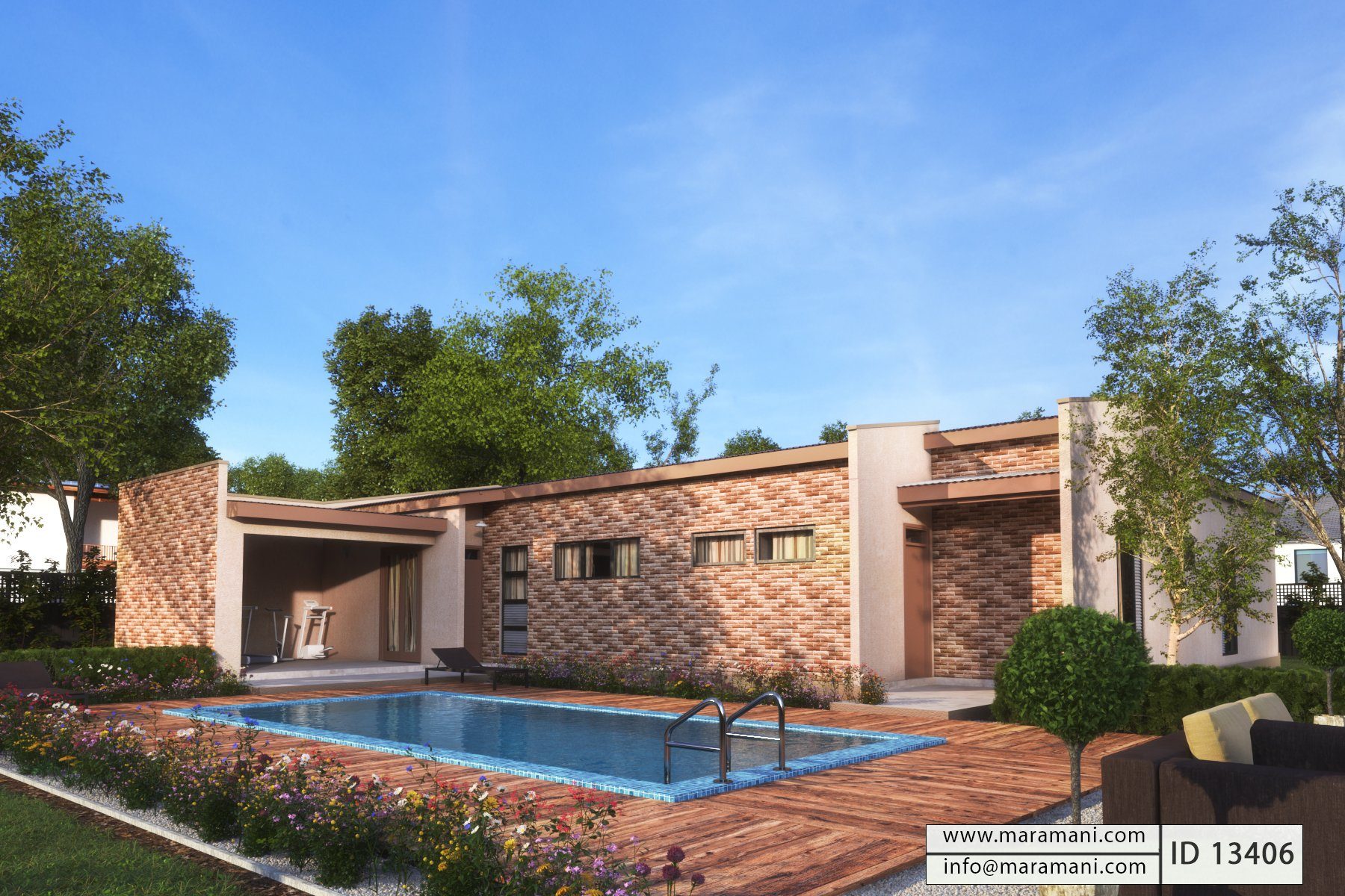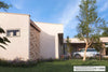 A beautiful modern house plan with 3 bedrooms of which one is an ensuite master bedroom. The plan closes off the front of the building from the living area and creates a private sanctuary eliminating noise and other disturbances from the street. From the entrance foyer, you have access to the open plan living room/kitchen/dining on one side and the bedrooms on the other side. The master bedroom has a walk-in closet and a big bathroom with space for both shower and bathtub. On the backside of the house, you also find a practical space for an outdoor gym or any other hobby you desire. This low-cost yet spacious house makes it ideal for any new family looking for a safe and practical home.