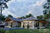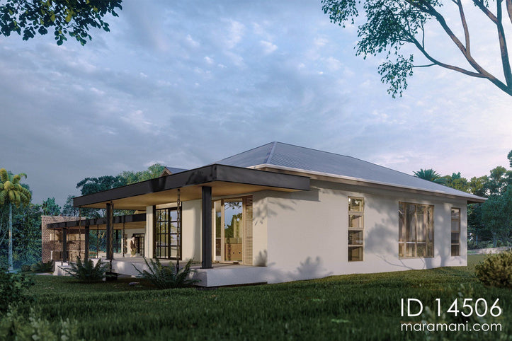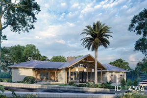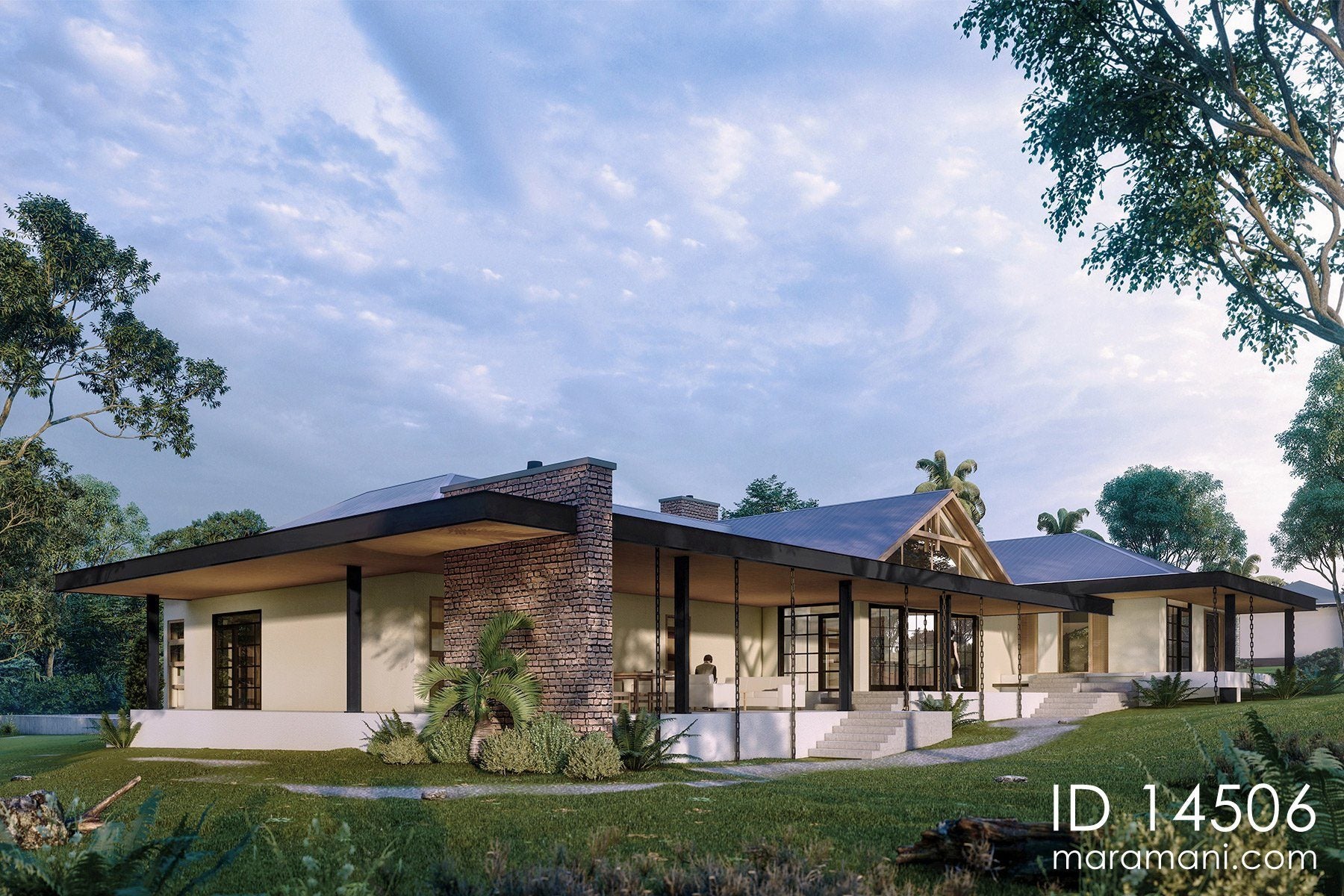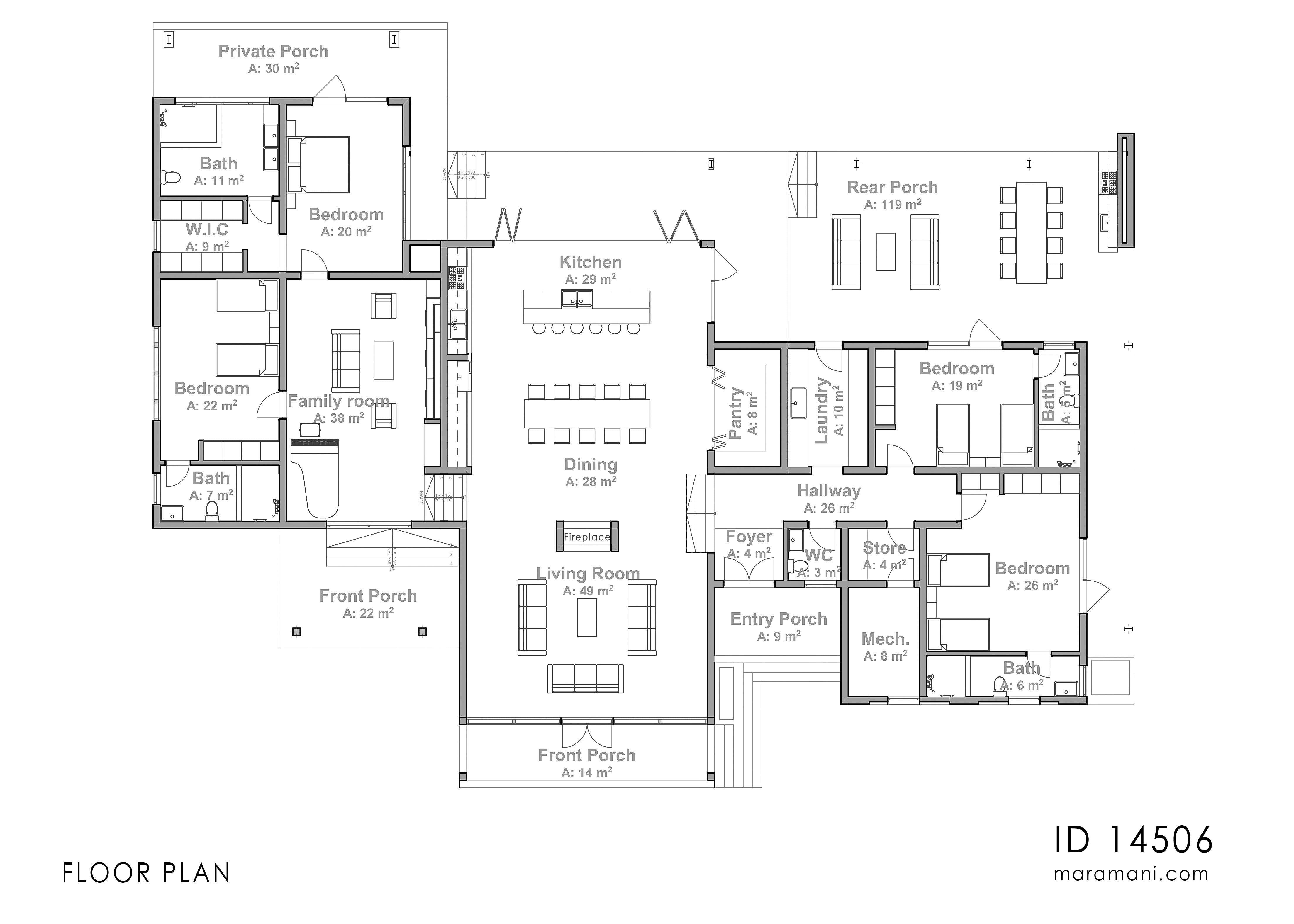 The opportunities are endless to this flexible modern ranch house. The wrap-around porch of this house plan adds to the immense curb appeal, while the well-appointed interior checks off all of your must-haves. With 630 square meters of living space, this plan has been carefully designed to fit the needs of any growing family. Just inside the home from the entry porch, you'll walk into a hallway that flows into the Living room. The Living room is separated from the open plan kitchen with dining by a double-sided fireplace. The huge island kitchen has plenty of counter space and a walk-in pantry. Relax on the cozy rear porch and discover the views to be jaw-dropping! The family chef will appreciate the presence of the outdoor kitchen on the rear porch. On the right side of the home, you'll find a laundry, public toilet, store, mechanical room, and two 2 bedrooms both en-suite. Other highlights on the left side of this plan include the family room,1 en-suite, and a spacious master suite with its walk-in closet and dual vanity bath.