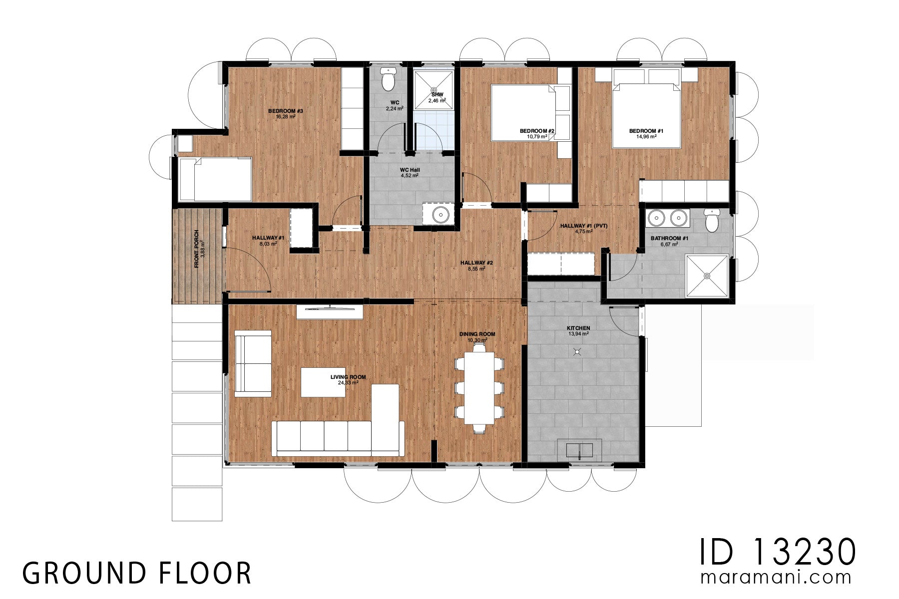 The house has 3 spacious bedrooms and 2 modern bathrooms. It's perfect for a family wanting a cozy, efficient home. The living room is a welcoming space for relaxation and fun. The dining room is perfect for family meals and gatherings. The kitchen is well designed for efficiency. The kitchen plan ensures that meal preparation is both easy and enjoyable.