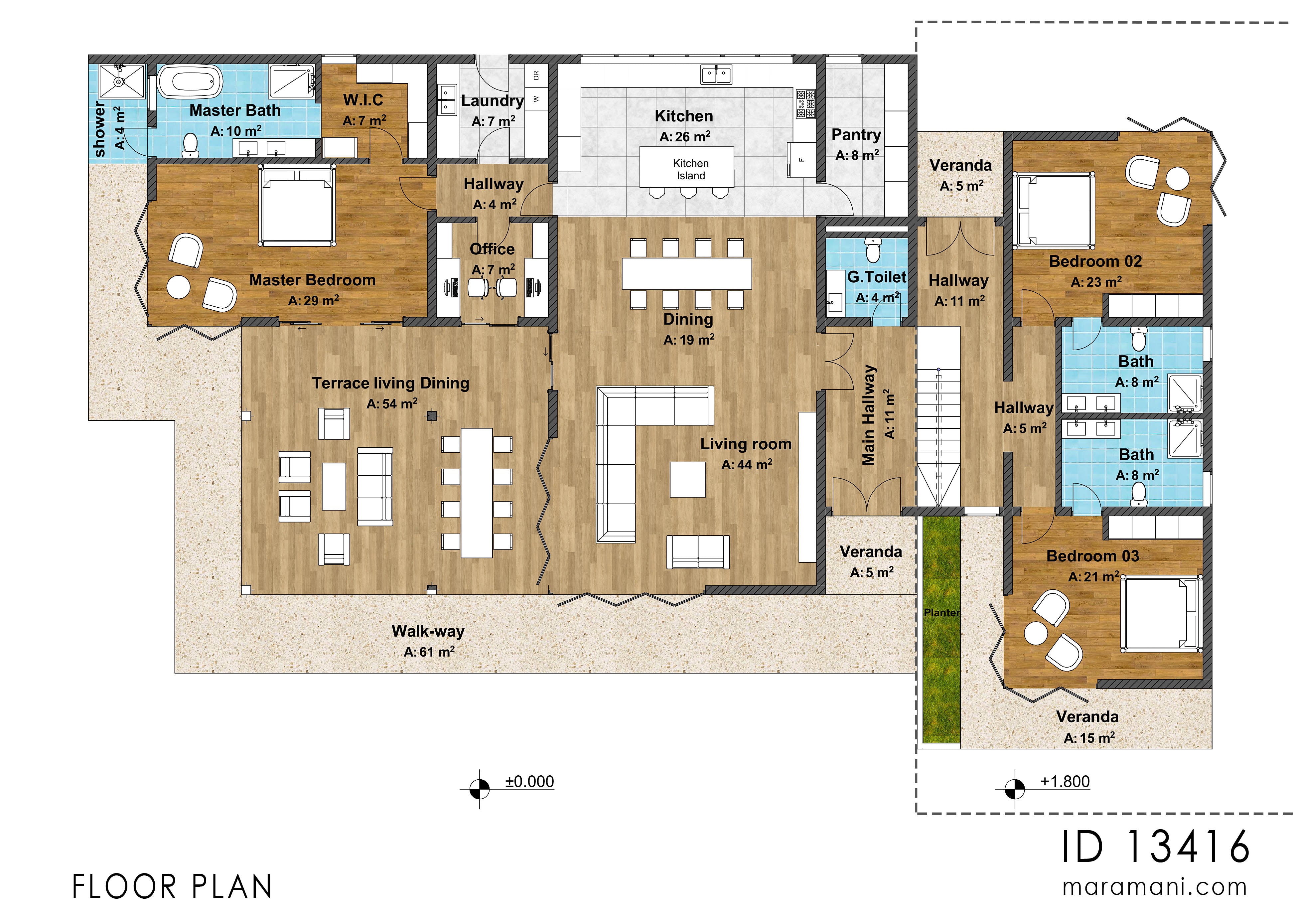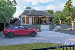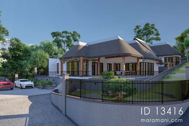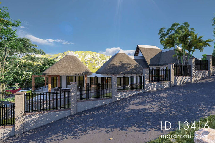 This is the perfect 3 bedroom thatched roof house plan for a piece of land that’s on a slope. Thatch roofs are the original African roofing methods that are environmentally conscious and simply beautiful to look at. Thatched roofs also offer excellent temperature control for your house and are quite durable. The plan prevents you from wasting money trying to level your patch of land by making use of the land as it is. Drive in through the elegant driveway at the bottom and start your journey upwards by walking up the short flight of stairs through the verandah into the spacious living room. The living room is gorgeously designed in an open layout giving you free flowing access to the dining room, kitchen, terrace dining area and subsequently the beautiful walkway that goes round half the house. The large kitchen is connected to a spacious pantry space and through the hallway you will find a conveniently placed laundry room that is on the opposite side of your home office. The en suite master bedroom is strategically placed on the extreme left corner of the house with the remaining bedrooms on the extreme opposite side, each with their own full baths. Each room is placed to give everyone a view no matter which part of the house one is one. You definitely want this plan for your sloping piece of land.