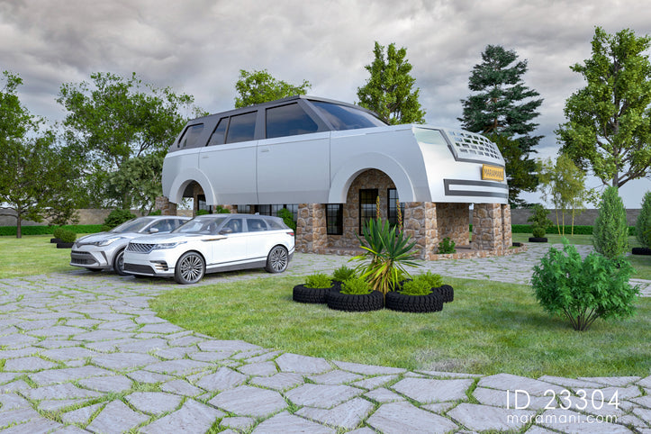 This is exemplified by the striking design depicting a car (Range Rover) on the rocks. It's a two-story structure rock base for ground floor and the car for the first floor. Despite its sad exterior, the design offers a luxurious interior that rivals that of a "Range Rover."