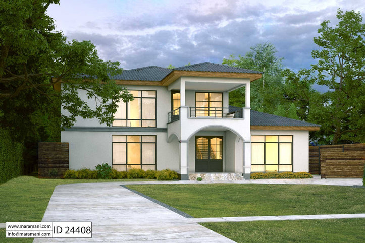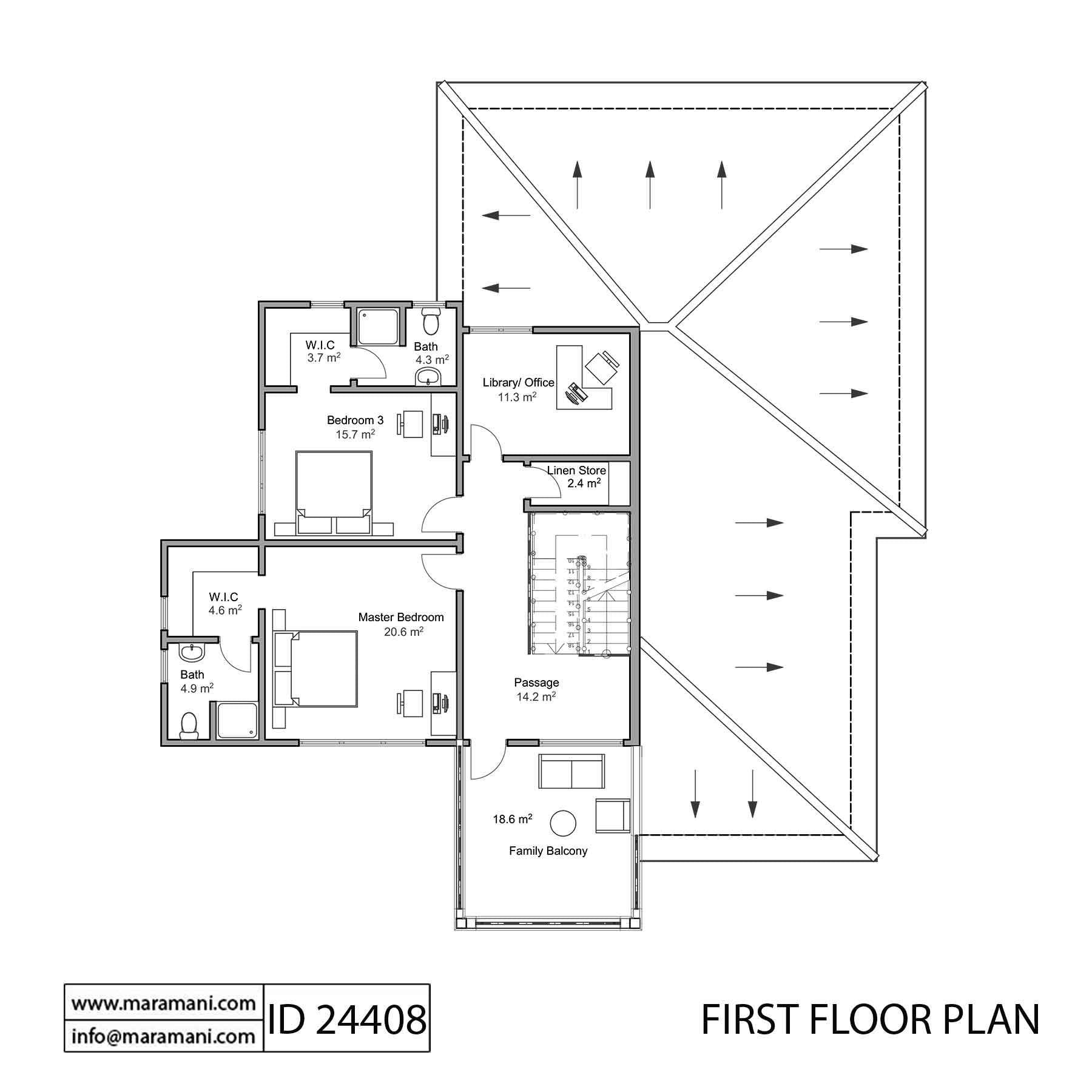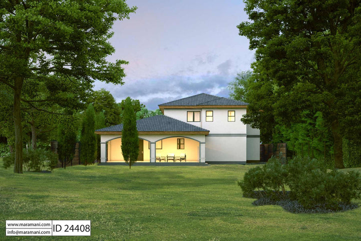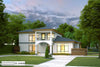 3 ensuite bedrooms with walk-ins plus a spare bedroom make up this urban house plan. A beautiful covered entry porch, that will make sure it will never rain on you when opening the door, leads you into the entrance hallway of this spacious home. From here you have a modern open-plan living room/dining/kitchen on your right side and two bedrooms on the left side. In the center of the building, a staircase takes you to the first floor where there is a small office, a linen store, a spacious balcony, and the reaming 2 bedrooms. The kitchen, which is placed right next to the laundry, has an island with a breakfast counter so you can easily entertain your guests while preparing a delicious meal for them. Finally, there is a 54-square meter verandah connected to the kitchen and dining for hosting those wonderful BBQ afternoons.